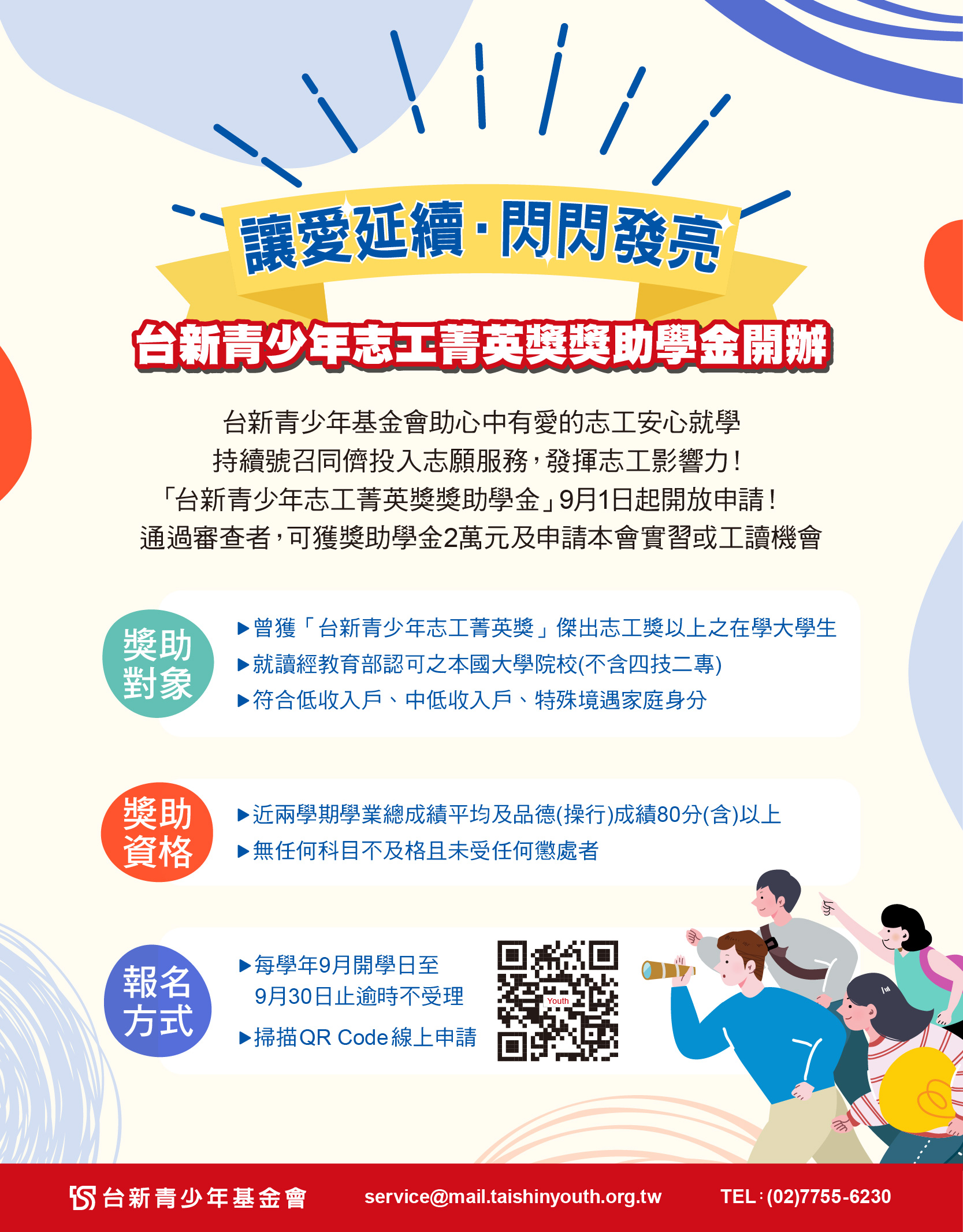 「台新青少年志工菁英獎獎助學金」9月1日起開放申請!